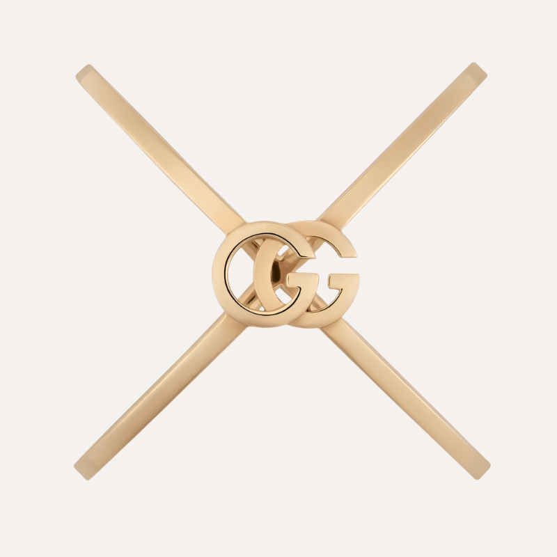 Signature GG Running styles, featuring the emblematic Double G, return as part of Gucci Love Parade, this time in a rose gold variation. This crisscross 18k ring is distinguished by the subtle House emblem.