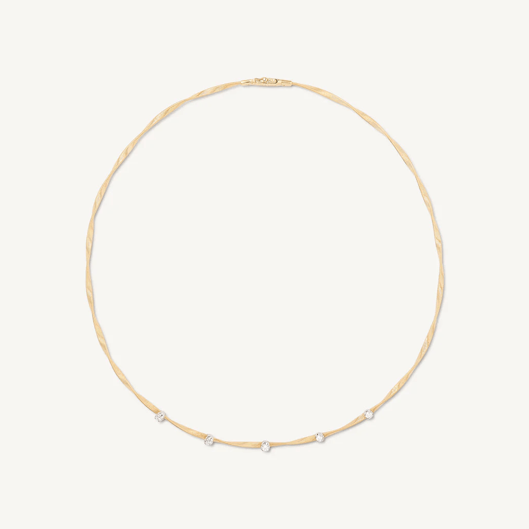 An elegant strand of twisted gold coil is embellished by five brilliant-cut diamonds. An elegant necklace for everyday wear.