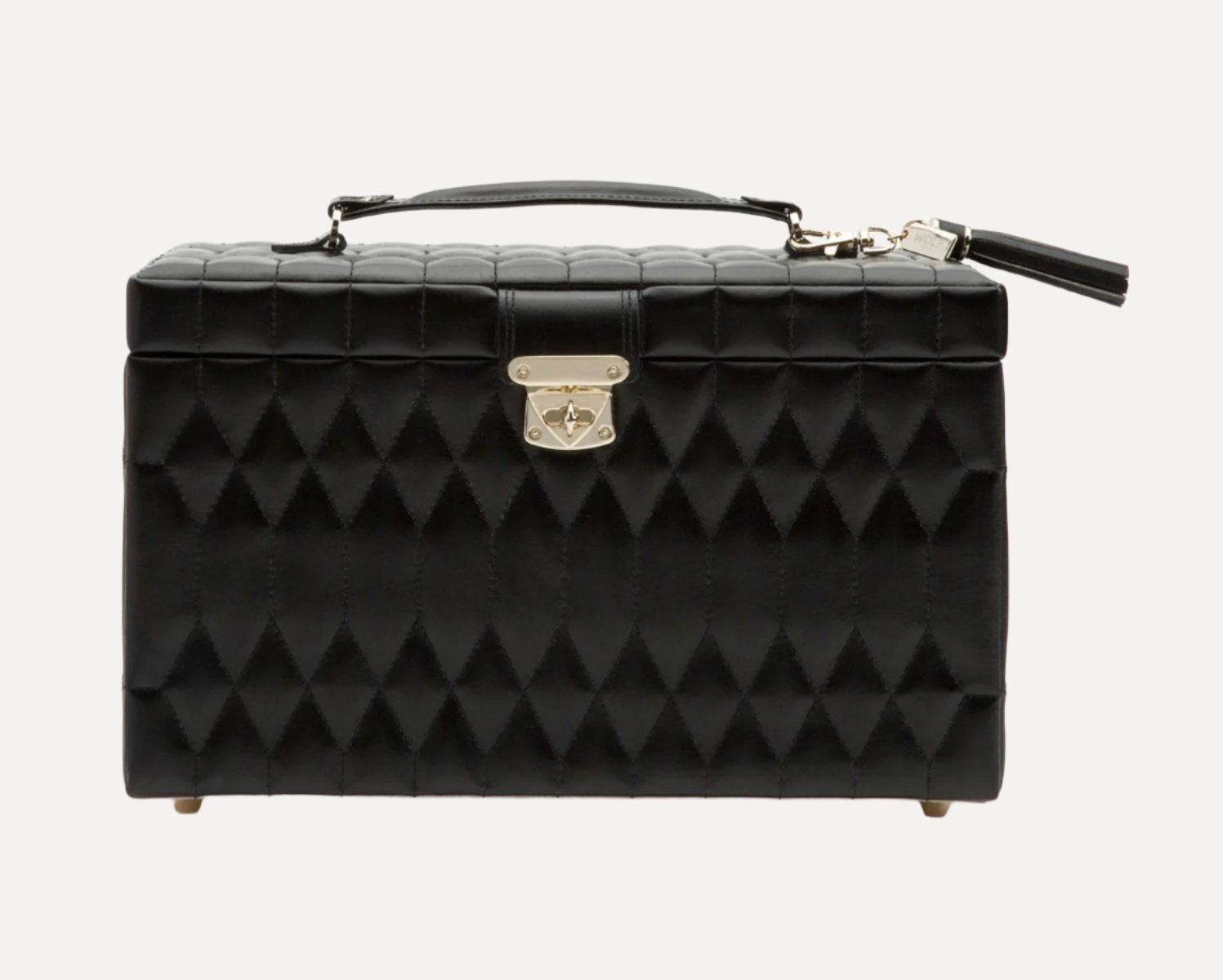 The embodiment of sophistication and style. The Caroline Large Jewellery Case, a timeless classic with elegant soft lines of the 50’s, supple diamond-quilted leather accented with gold hardware. This refined case is the perfect home for your precious jewellery and heirlooms.