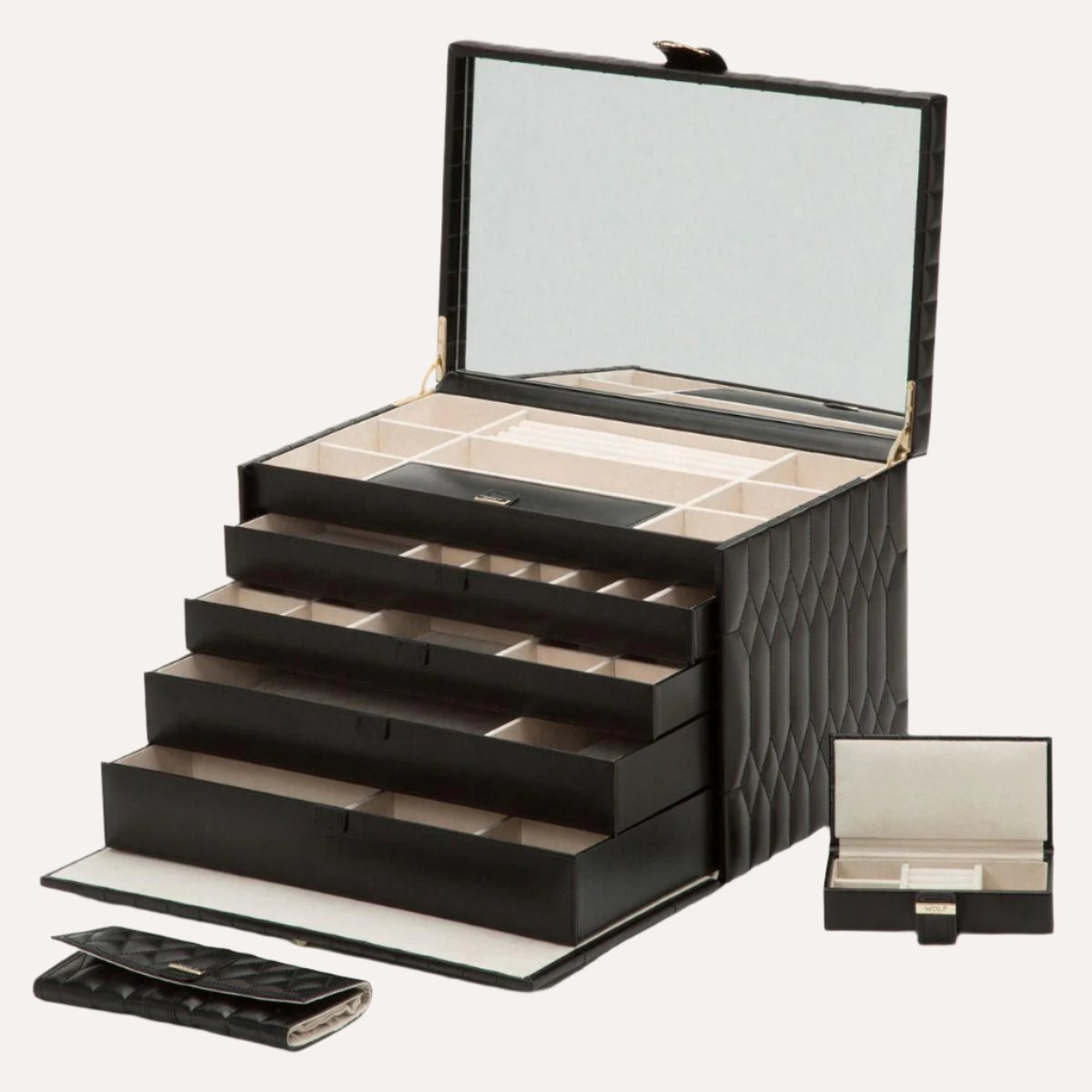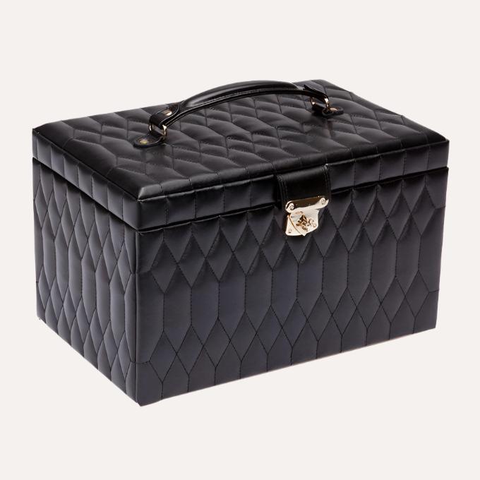 The embodiment of sophistication and style. The Caroline Extra Large Jewellery Case, a timeless classic with elegant soft lines of the 50’s, supple diamond quilted leather accented with gold hardware. This refined case is the perfect home for your precious jewellery and heirlooms.