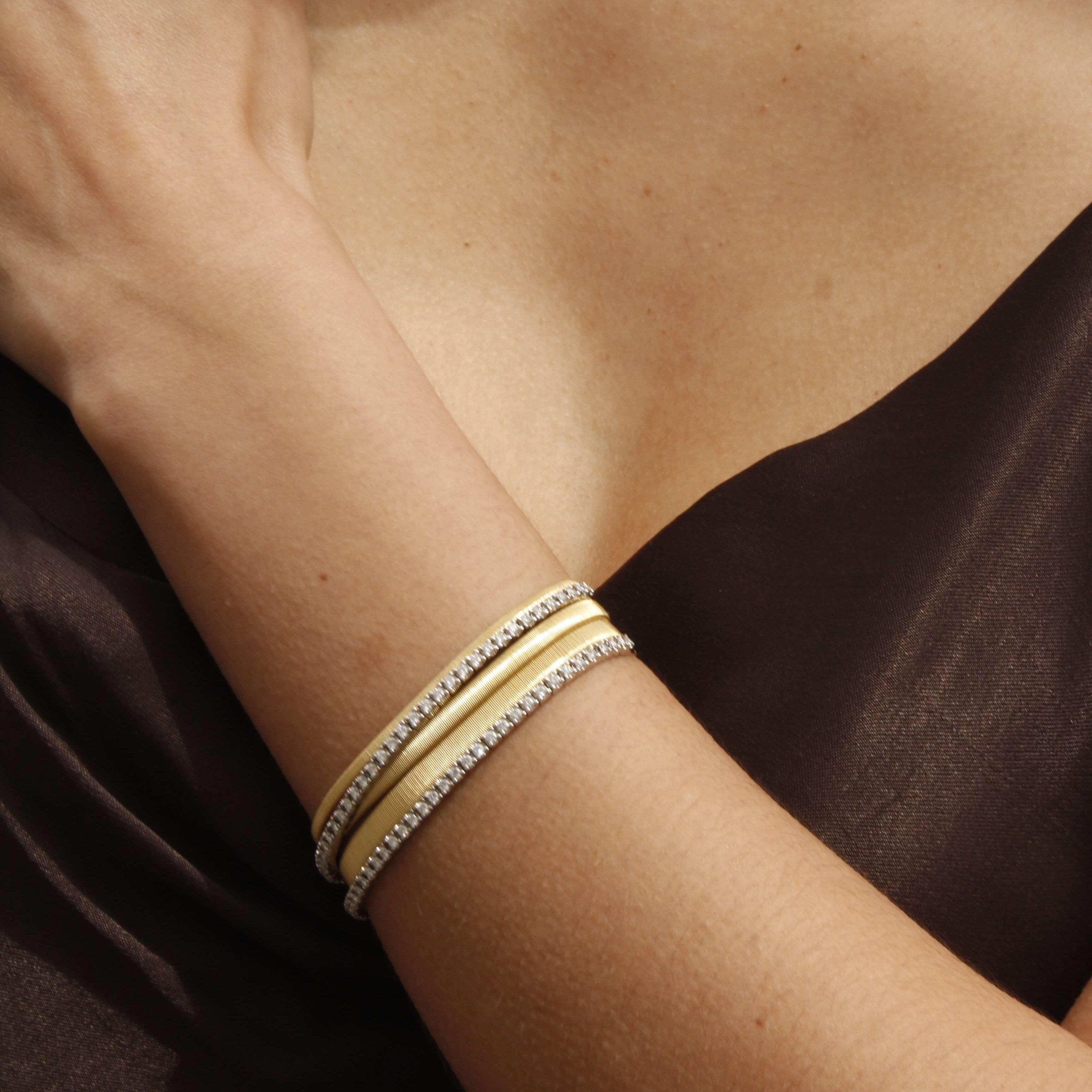 Sophisticated in design, this five-strand flat coil tennis bracelet features an elegant brilliant-cut diamond pavé. Crafted in 18kt yellow gold, it bears the hallmark of a true timeless icon.