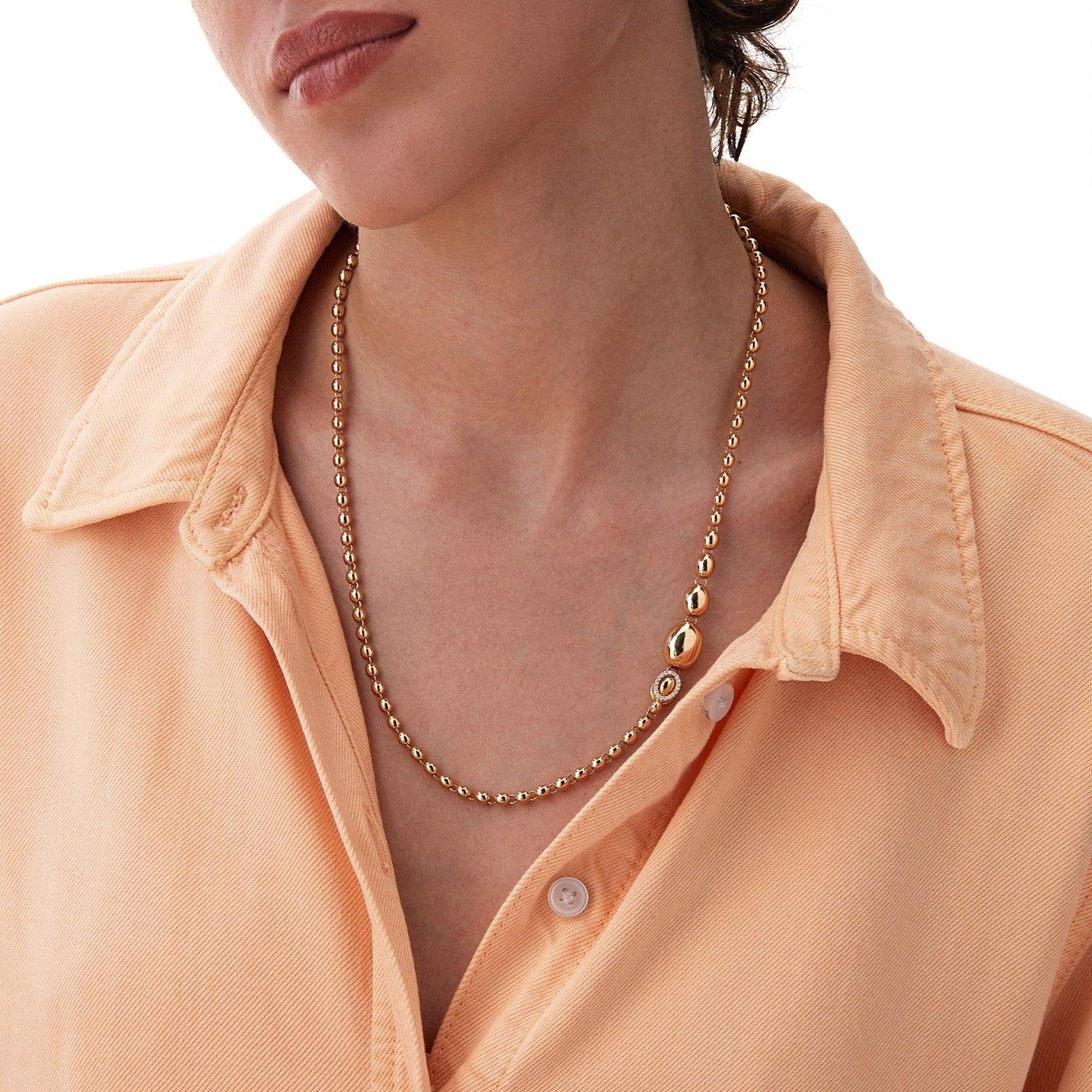 The pearl necklace according to Nanis: 18kt rose gold boules, that culminate in a clasp of diamonds ready to embrace each of the beads of this jewel, opening it to its endless possibilities. This string of gold pearls can in fact become a sensual chocker, but also a classic channel, or a transgressive y necklace. Interpret it according to your look and your personality!