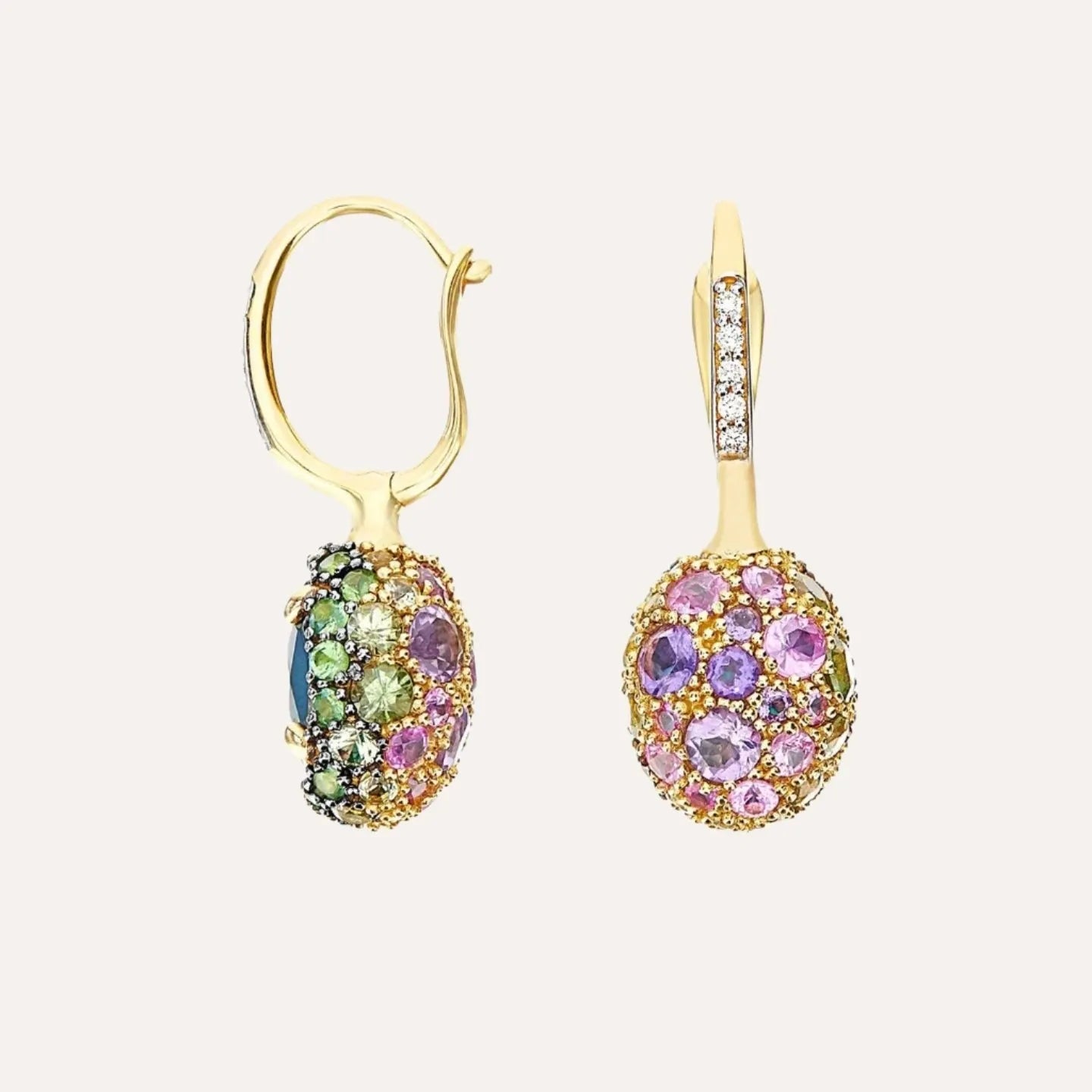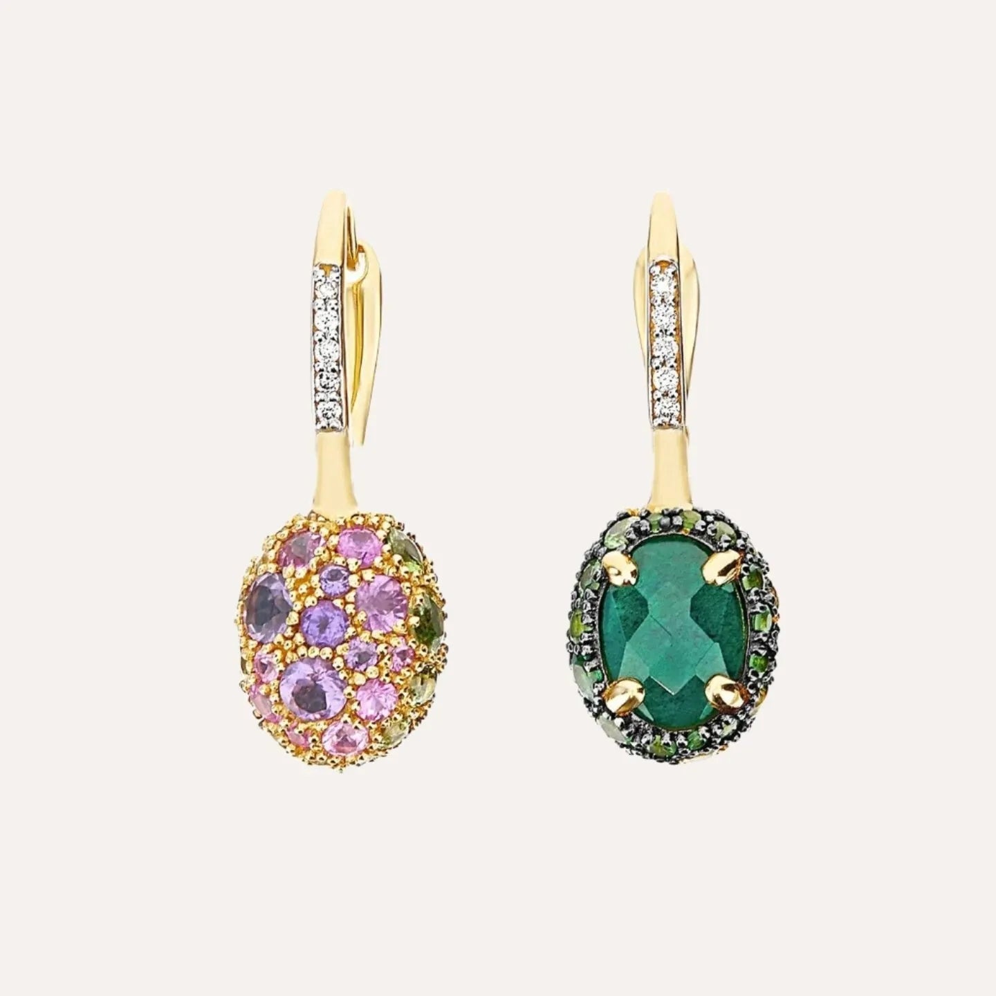 “Ciliegine Reverse” (literally “reverse cherries”) were born from the encounter between two of the most iconic nanis jewels. Very high manufacturing, creativity and genius come together in these earrings that reveal their double with a simple gesture. A signature piece in 18kt gold that alternates a central doublette with green labradorite and rock crystal with a pavé of pink sapphires, amethysts, green sapphires and tsavorites. Let yourself be seduced by this luxurious play of light!
