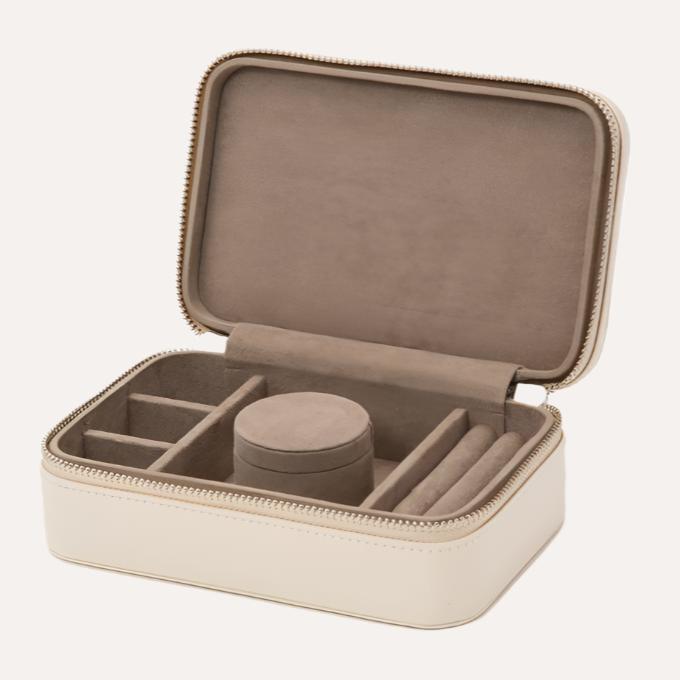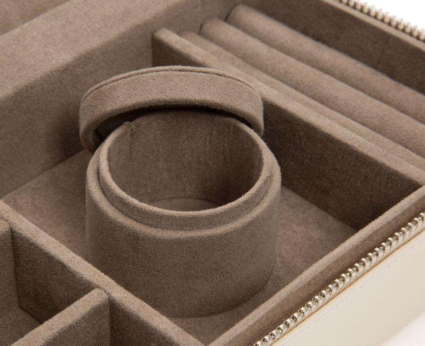- Storage: 1 bracelet compartment with charm well, 3 open compartments, 3 ring rolls